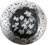 Assiettes en carton, peinture métal, perles, paillettes . CP |