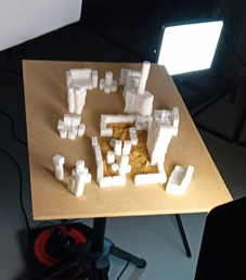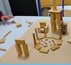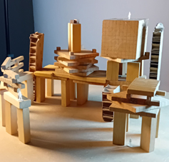 Avec des petits morceaux de bois nous avons composé notre ville idéale, avec immeubles, espaces de promenade.....Nous y avons mis des petits personnages. |