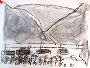 Le fusain est comme un crayon, il est en bois brûlé. C'est le charbon qui laisse les lignes.